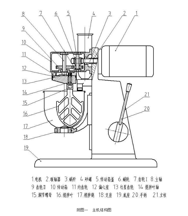 2、工作原理雙速電動(dòng)機(jī)通過(guò)聯(lián)軸器將動(dòng)力傳給傳動(dòng)箱內(nèi)的蝸桿再經(jīng)蝸輪及一對(duì)齒輪和傳給主軸并減速。主軸帶動(dòng)偏心座同步旋轉(zhuǎn),使固定在偏心座上的攪拌葉進(jìn)行公轉(zhuǎn)。同時(shí)攪拌葉通過(guò)攪拌葉軸上端的行星齒輪圍繞固定的內(nèi)齒輪完成自轉(zhuǎn)運(yùn)動(dòng)。攪拌鍋與支座用偏心槽旋轉(zhuǎn)鎖緊、砂罐內(nèi)加砂子后,可在規(guī)定時(shí)間自動(dòng)加砂或手動(dòng)加砂,手柄用于升降和定位攪拌鍋位置用。